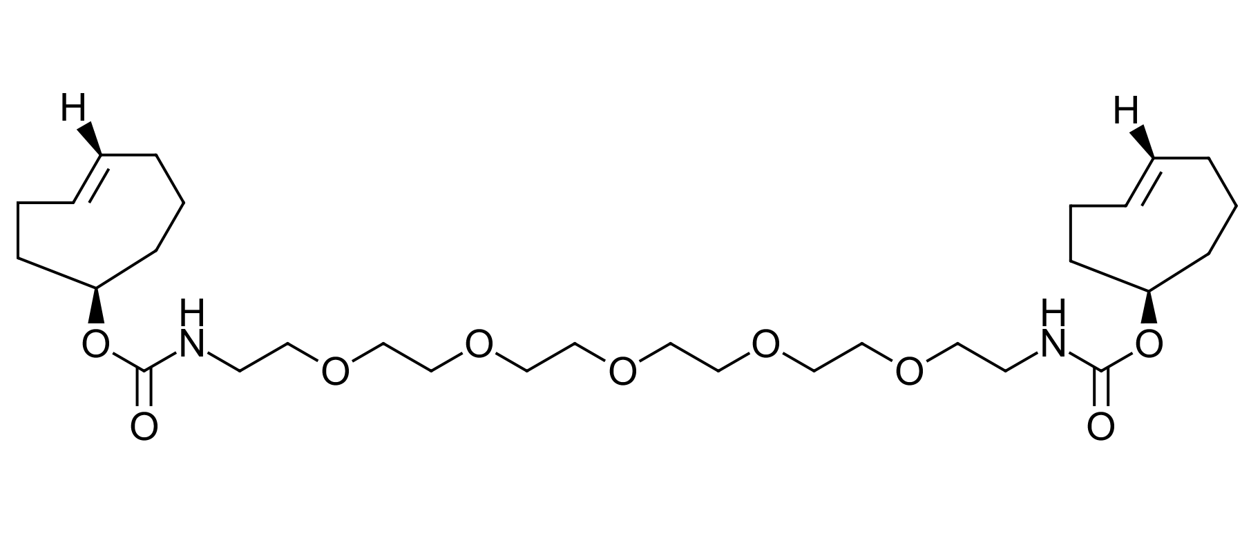 TCO-PEG5-TCO is a homobifunctional linker containing two TCO moieties for inverse electron demand Diels-Alder cycloaddition reactions. TCO will react with tetrazines via inverse electron demand Diels-Alder cycloaddition to form a stable dihydropyridazine linkage. The extremely fast kinetics and selectivity enables the conjugation of two low abundance biopolymers in an aqueous and otherwise complex chemical environment. This bioorthogonal reaction possesses excellent selectivity and biocompatibility such that the complimentary partners can react with each other within richly functionalized biological systems, in some cases, living organisms. Thus, tetrazine-TCO ligation has found numerous applications in fluorescent imaging, drug delivery, PET and SPECT imaging, radionuclide therapy, radiochemistry or drug target identification among several others.
